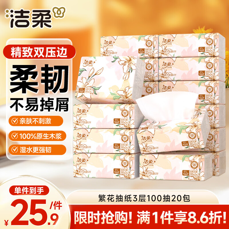 繁花系列3层100抽*20包 可湿水面巾纸 柔韧卫生纸 整箱纸巾