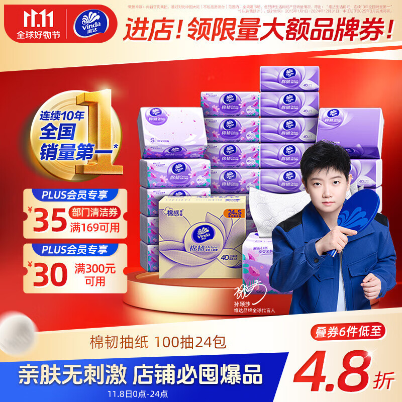 【孙颖莎推荐】棉韧3层100抽*24包S码 亲肤无刺激 纸巾 整箱