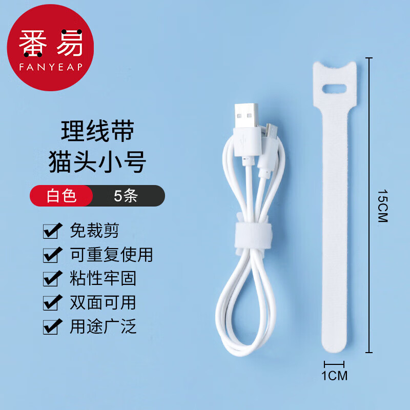 番易15Y理线器B1P273-0728-分线整理魔术贴数据线收纳自粘扎带固定绑 白色猫头小号5条 默认