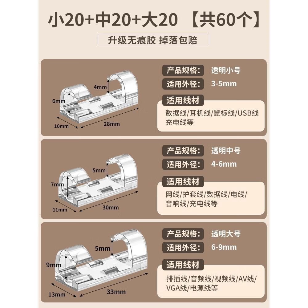 固定器网线走线集线卡子理线器数据线卡扣插排固定器 小+中+大各20个共60个