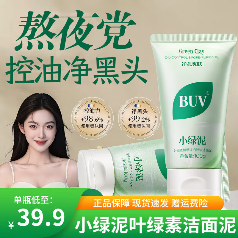 BUV叶绿素植萃净透控油洁颜泥小绿泥官方正品旗舰店氨基酸洗面奶 BUV新升级小绿泥(1瓶装)*100g
