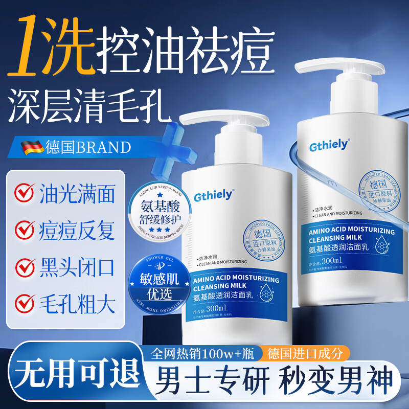 GTHIELY德国氨基酸洗面奶男士专用控油祛痘去黑头收缩毛孔美白深层清洁 3瓶周期装【到手2瓶价】