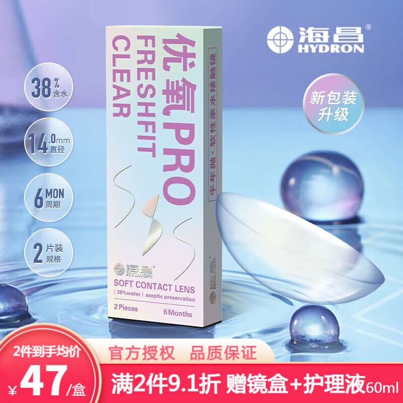 海昌HYDRON 近视透明隐形眼镜优氧PRO半年抛2片装 清朗舒适水润透氧 800度