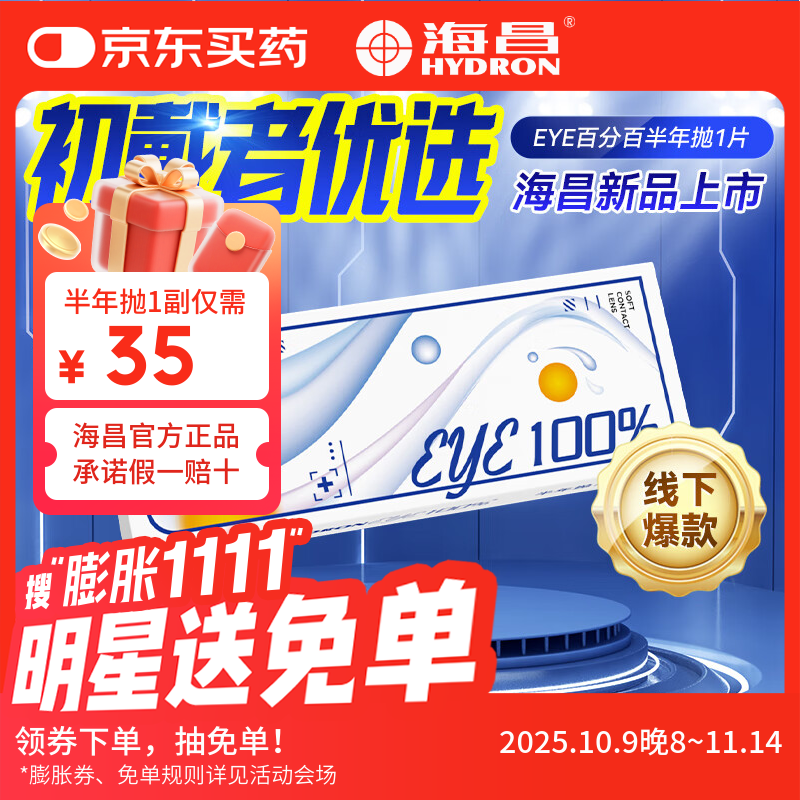 海昌(HYDRON)近视隐形眼镜半年抛2片装eye100%小直径官方旗舰店正品 1片 100度