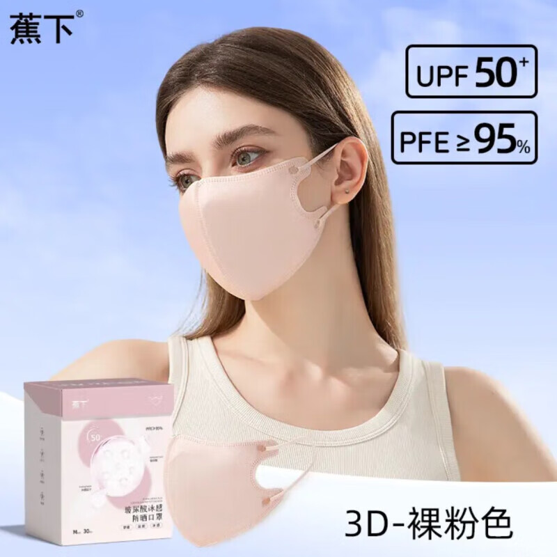 蕉下冰感防晒口罩防紫外线UPF50+轻薄透气女3d立体口罩一次性口罩 裸粉色1盒 30个 M码 (中码)12.8*12厘米