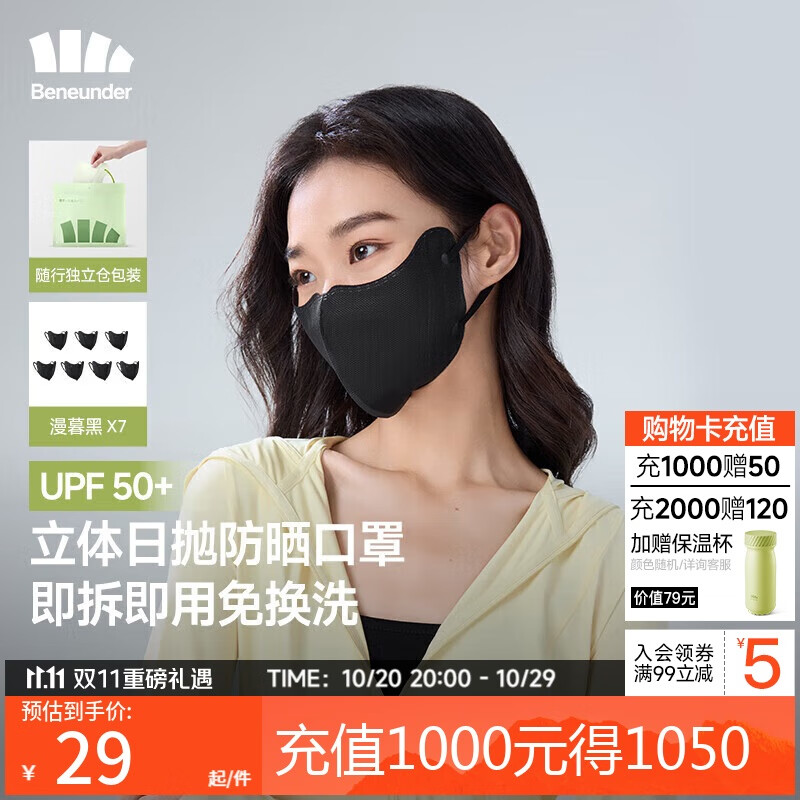 beneunder日抛防晒口罩女全脸防晒面罩防紫外线UV33924漫暮黑(x7)S