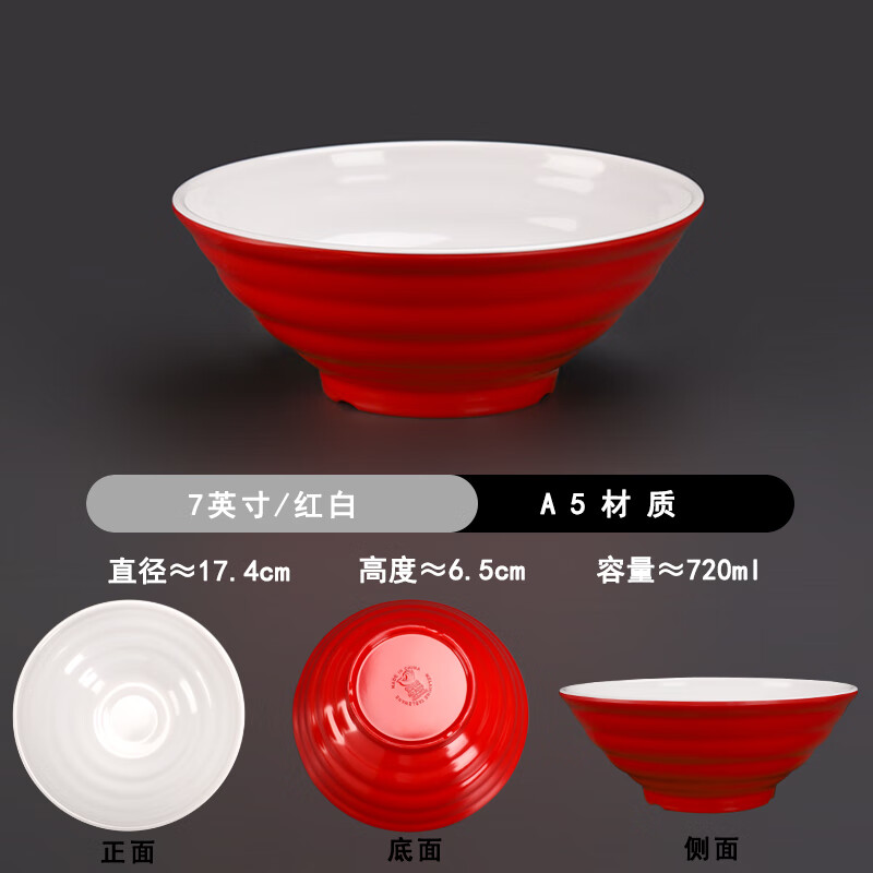 甜雅静A5密胺螺纹双色面碗商用面馆专用耐高温螺蛳粉米线拉面麻辣烫大碗 7英寸红白螺纹碗 【A5耐高温】