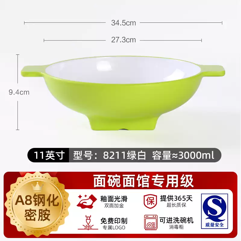 中掌柜网红A8加厚密胺双耳麻辣烫碗香锅冒菜碗螺蛳粉碗定制商用大碗专用 绿白11英寸A8钢化5倍加厚 1.00个