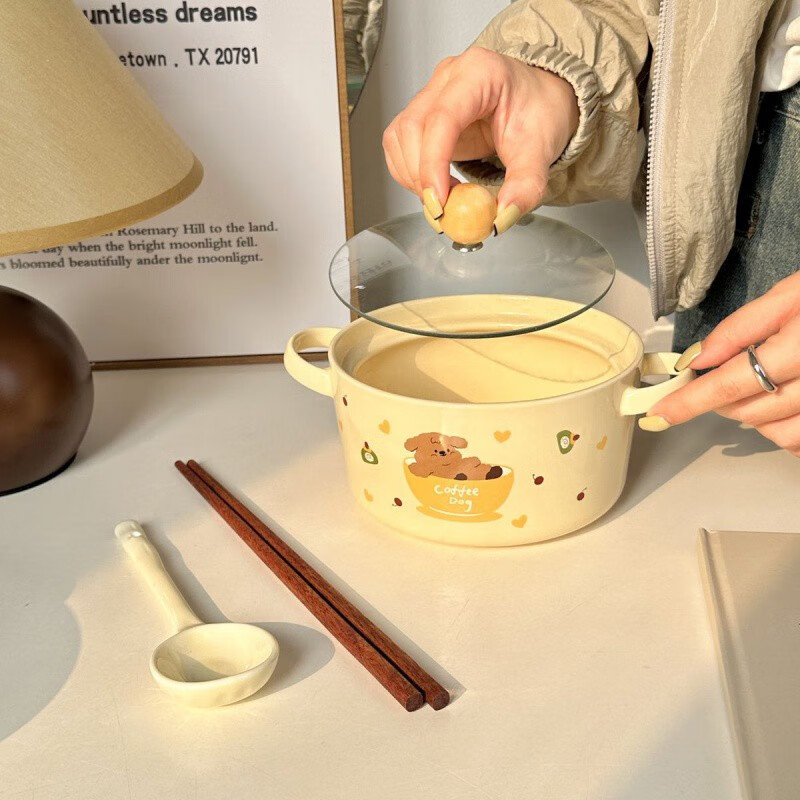 大碗专用 ins奶油泡面学生宿舍螺蛳饭碗粉碗双耳宿 A咖啡小狗-双耳泡面碗+玻璃盖