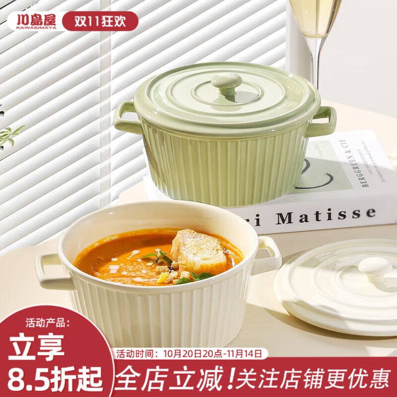 川岛屋奶油风双耳汤碗大号家用2024新款陶瓷带盖泡面碗螺蛳粉汤盆 7.5英寸双耳汤碗奶白(不带盖)
