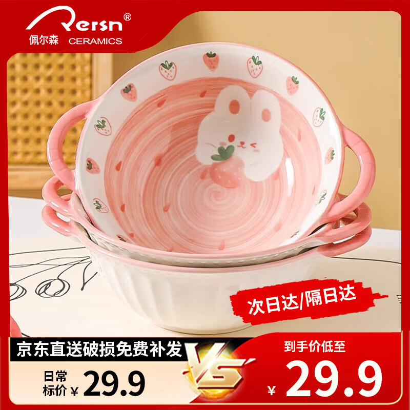 佩尔森卡通陶瓷双耳汤碗家用吃面碗汤碗泡面碗餐具 草莓兔汤碗带勺子