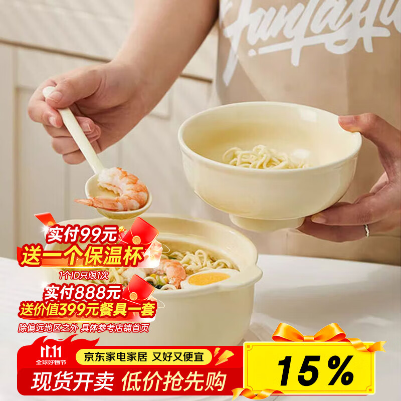 几物森林 陶瓷碗双耳碗泡面碗学生宿舍大汤碗家用一人食带盖勺奶油白800ml