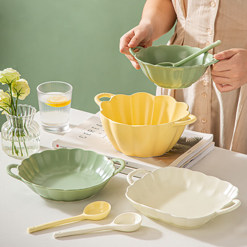 素美吉(SUMEIJI) 汤碗双耳深碗ins风家用大号面碗陶瓷沙拉碗高颜值螺蛳粉专用碗 绿-9英寸深碗+勺