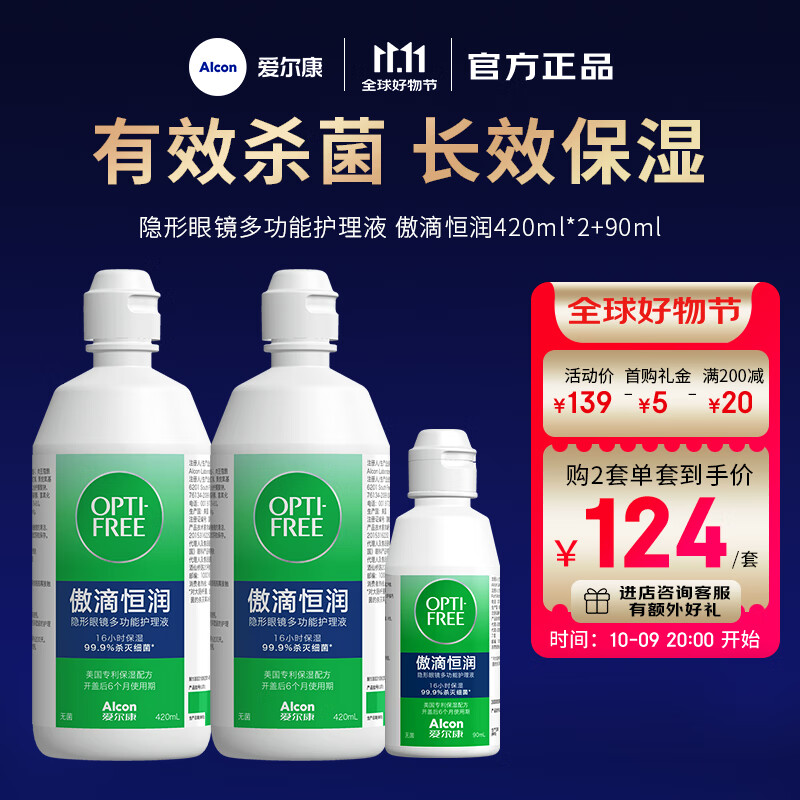 爱尔康傲滴第三代恒润隐形眼镜护理液美瞳眼镜杀菌保湿多功能小瓶套装 恒润420ml*2+90ml