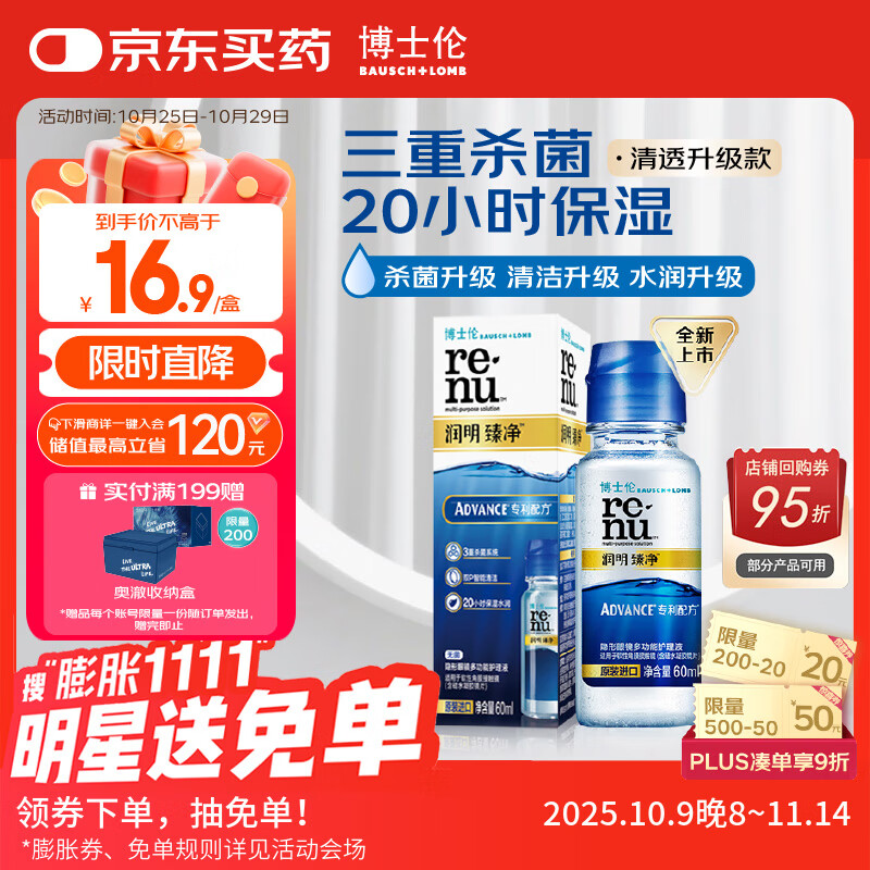 博士伦润明臻净60ml隐形眼镜水护理液美瞳清透升级版小瓶杀菌清洁