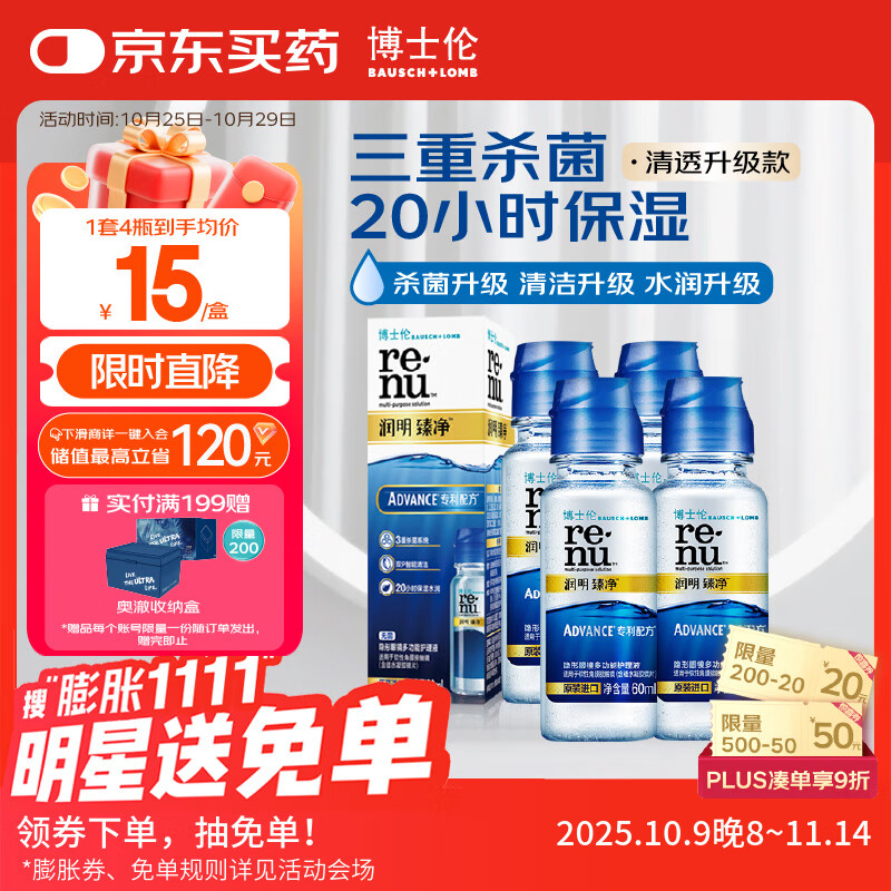 博士伦润明臻净60mlx4瓶隐形眼镜水护理液美瞳清透升级版小瓶杀菌清洁