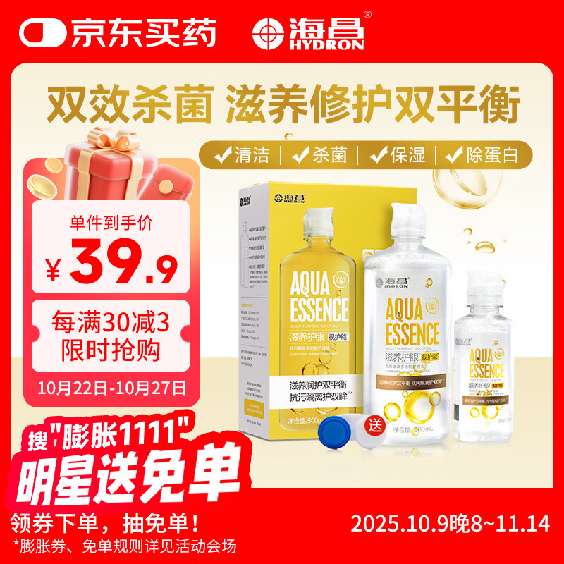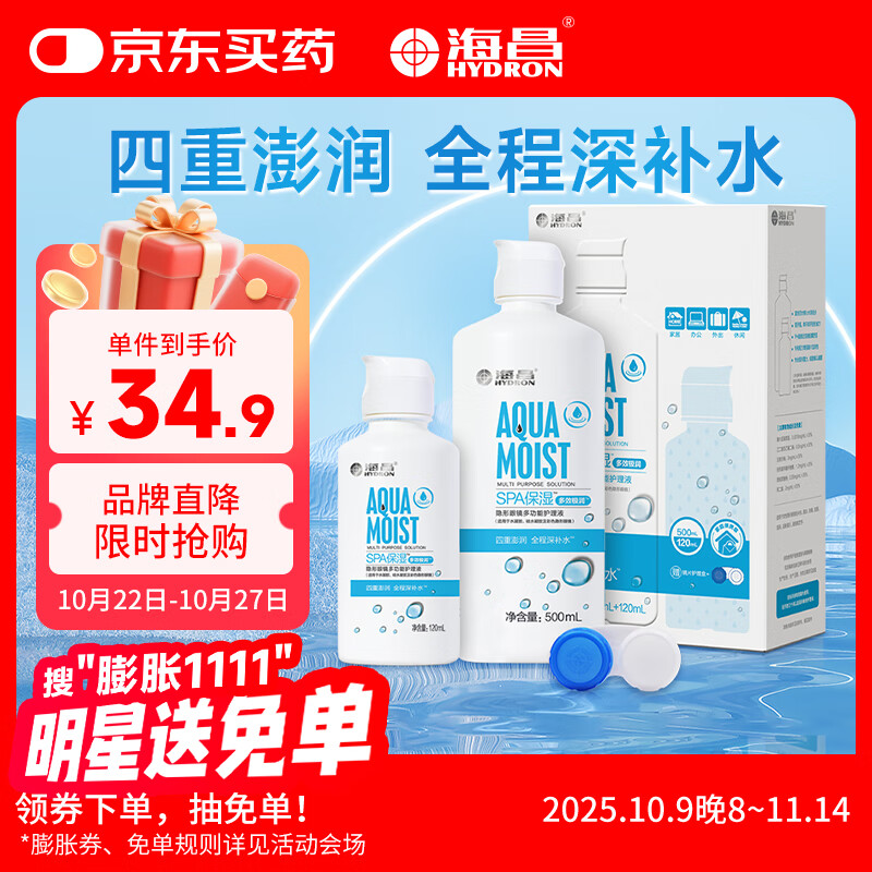 海昌杀菌护眼】隐形眼镜护理液500+120ml大小瓶除蛋白正品美瞳盒药水 智能洁净】水亮洁120ml