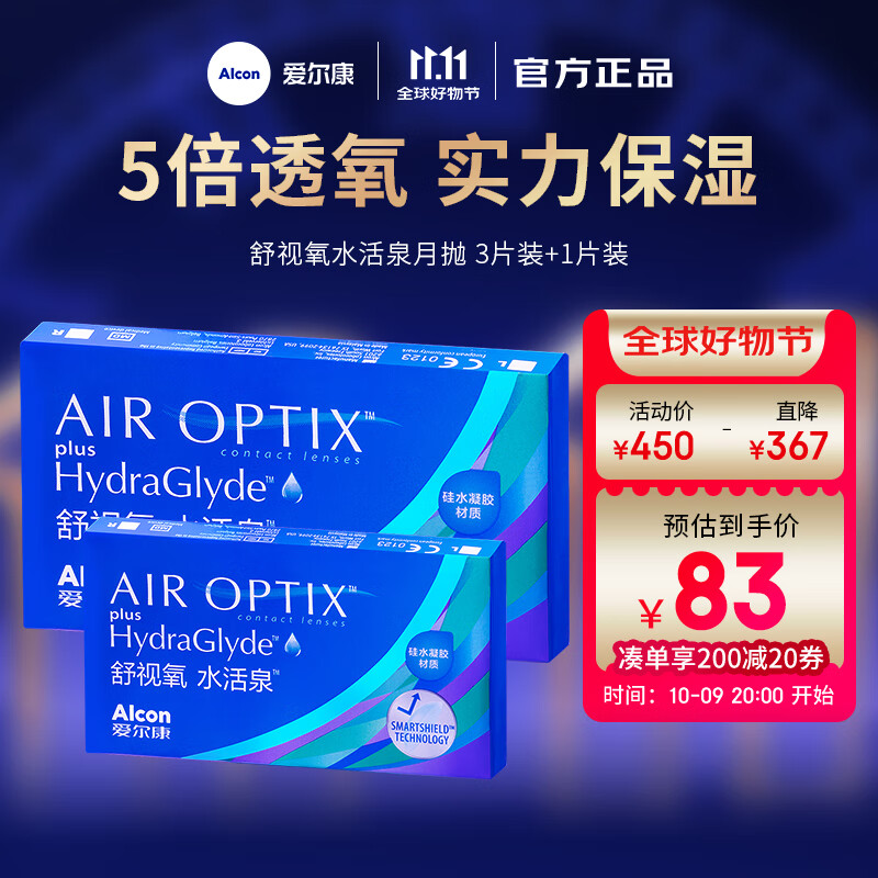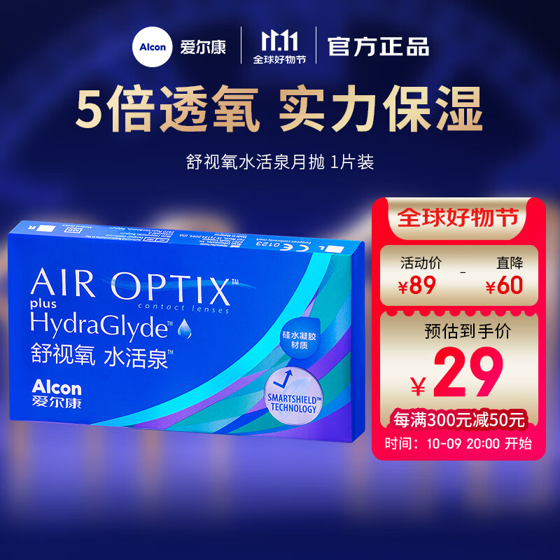 爱尔康(Alcon)视康舒视氧水活泉月抛硅水凝胶保湿高透氧近视隐形眼镜 水活泉月抛1片 400度