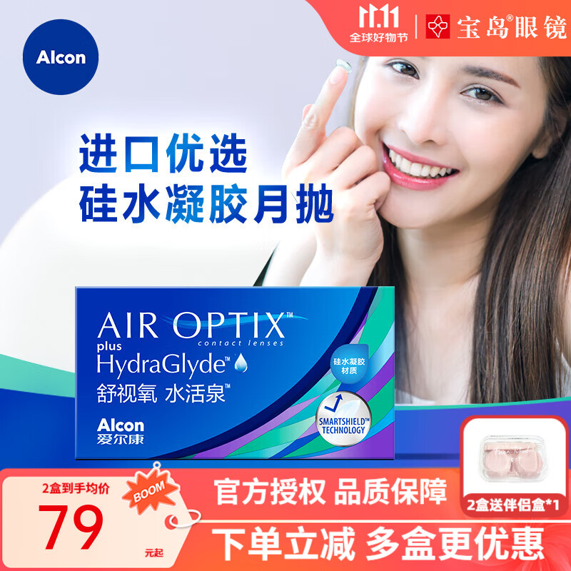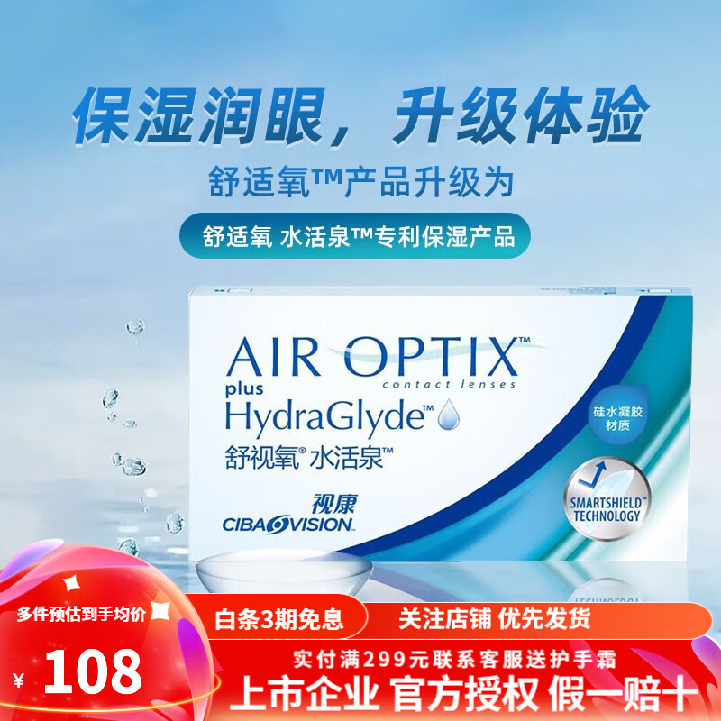 【速发】爱尔康视康舒适氧水活泉光润隐形眼镜硅水凝胶透明 月抛3片装 850度