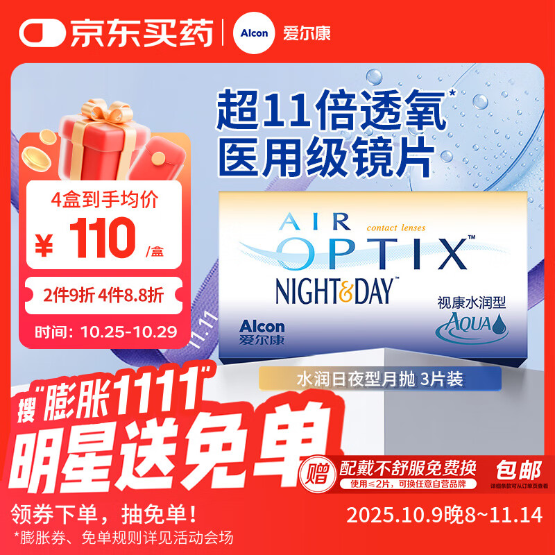 爱尔康 水润日夜型隐形眼镜月抛 高透氧进口硅水凝胶 3片装 125度