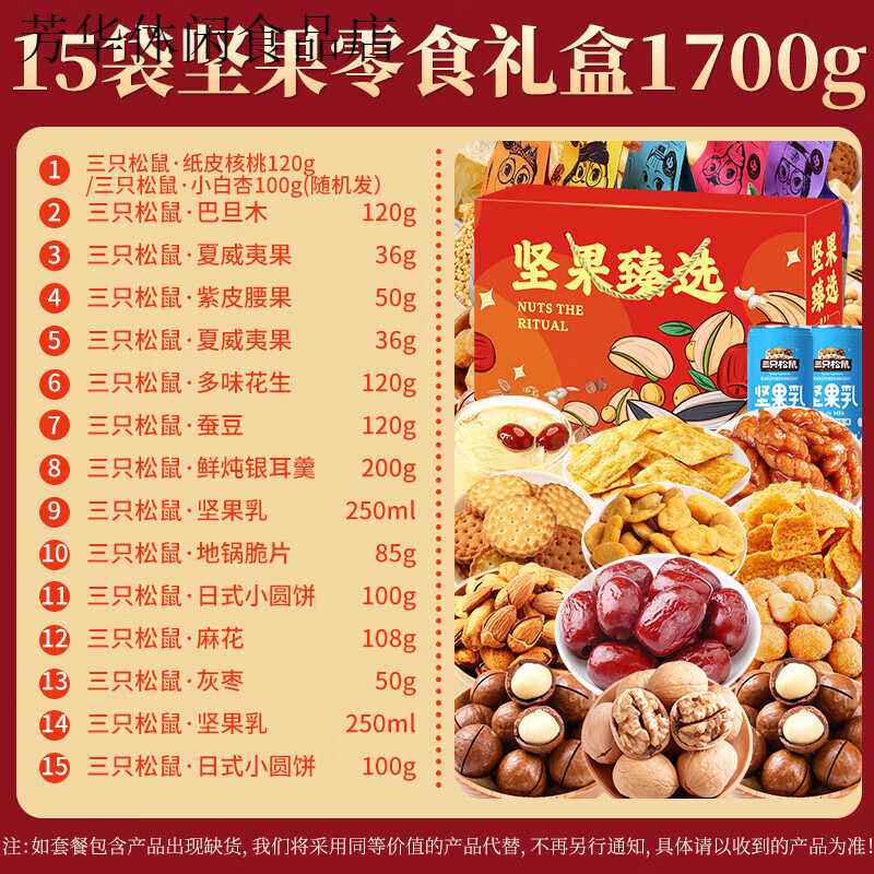 三只松鼠坚果零食礼盒装孕妇休闲混合干果大全小吃食品整箱 15袋坚果零食礼盒1700g