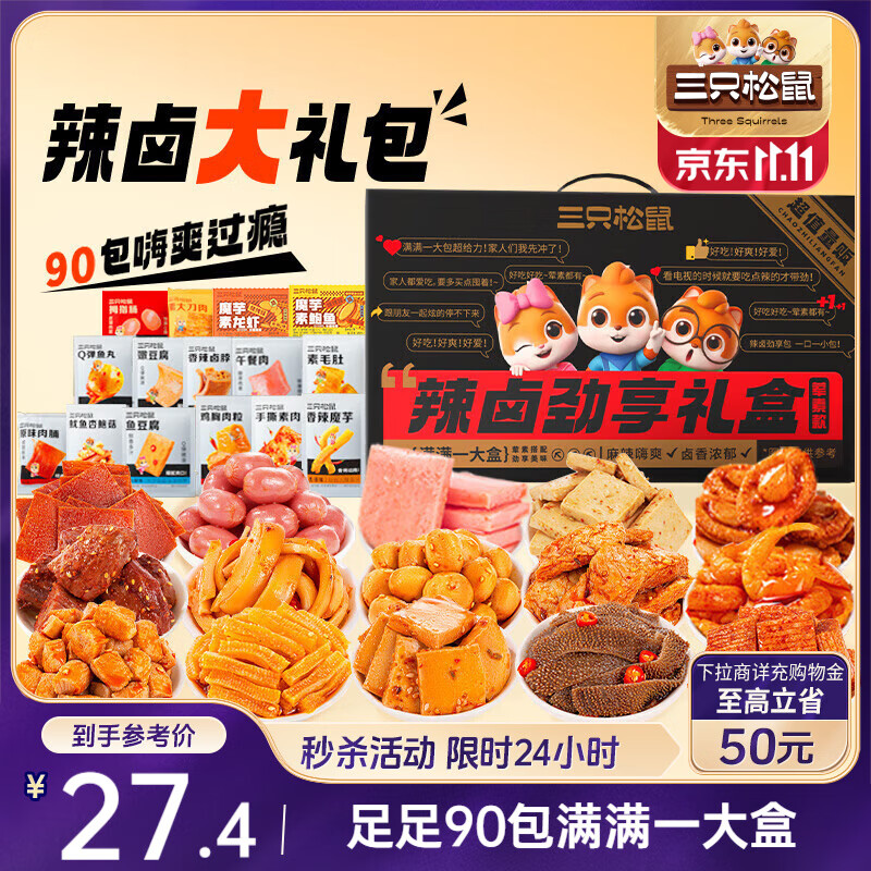 三只松鼠辣卤大礼盒90包辣条魔芋爽猪肉脯卤味休闲