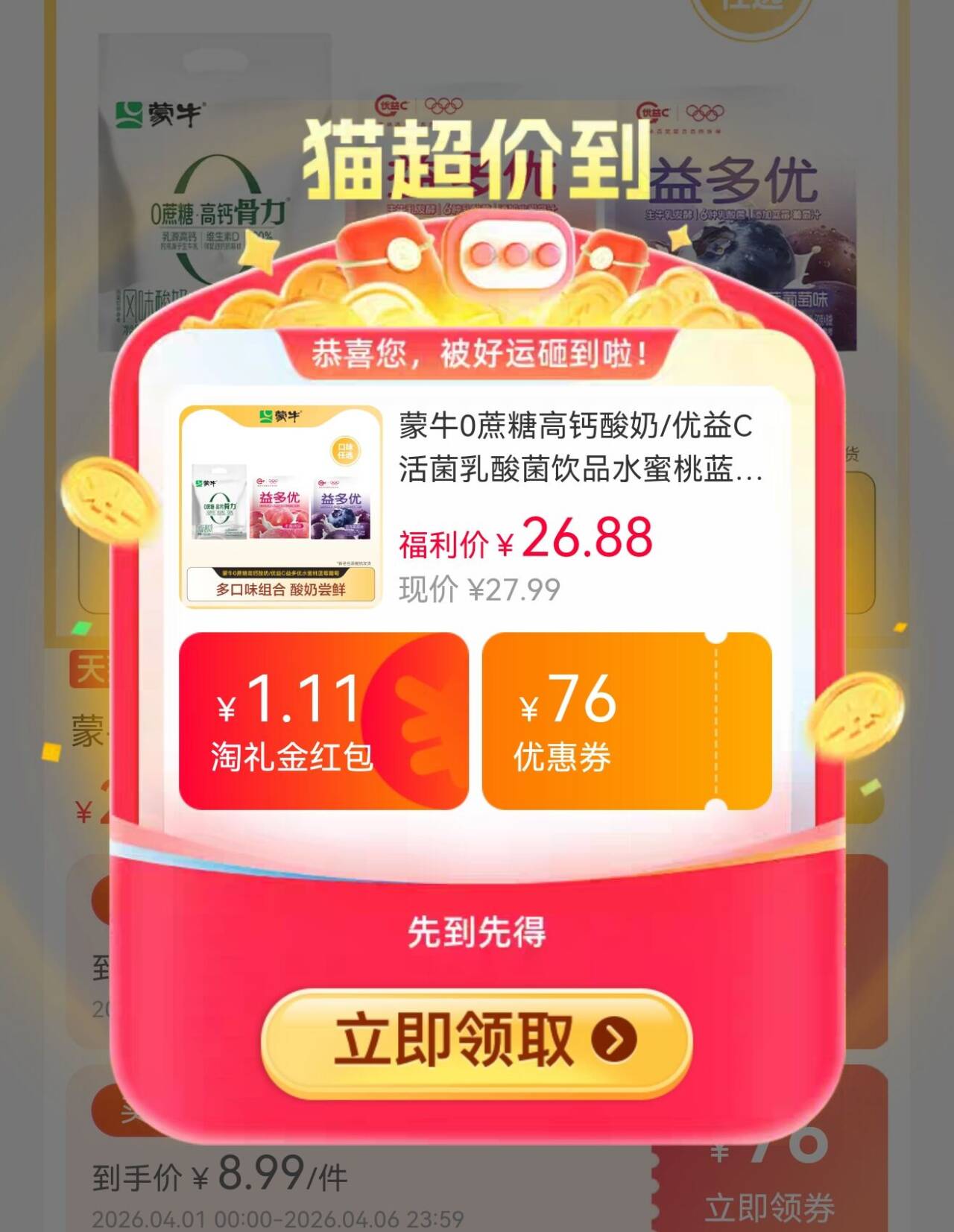 蒙牛0蔗糖高钙酸奶8袋装 天降任4件